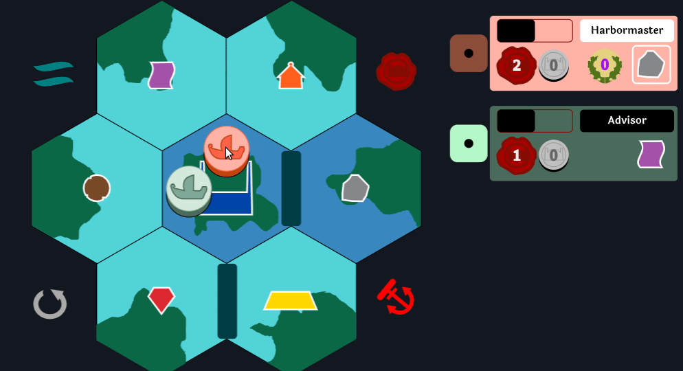 When starting a game with two players, a third ship (white) will spawn in the market's zone. This ship also has an influence die, and may block your movement like any other player ship (trimming its value on failed attempts).