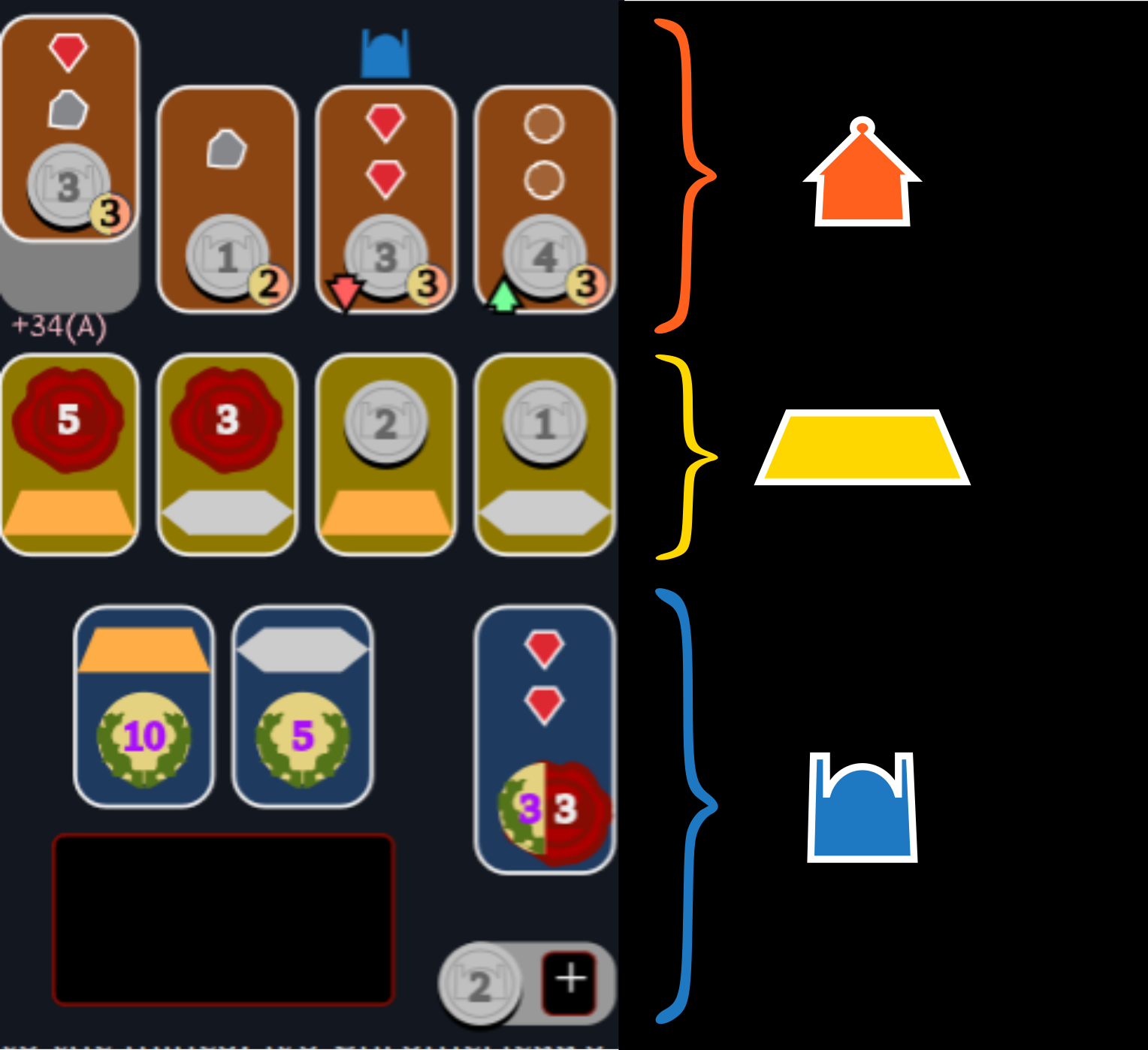 A small arrow in the bottom left corner signifies that the standard coin value has been modified. The upwards green arrow means +1 value and the downwards red arrow -1 value, respectively. These two modifiers are assigned randomly to the three market slots at the start of the game and are not linked to the market cards themselves.