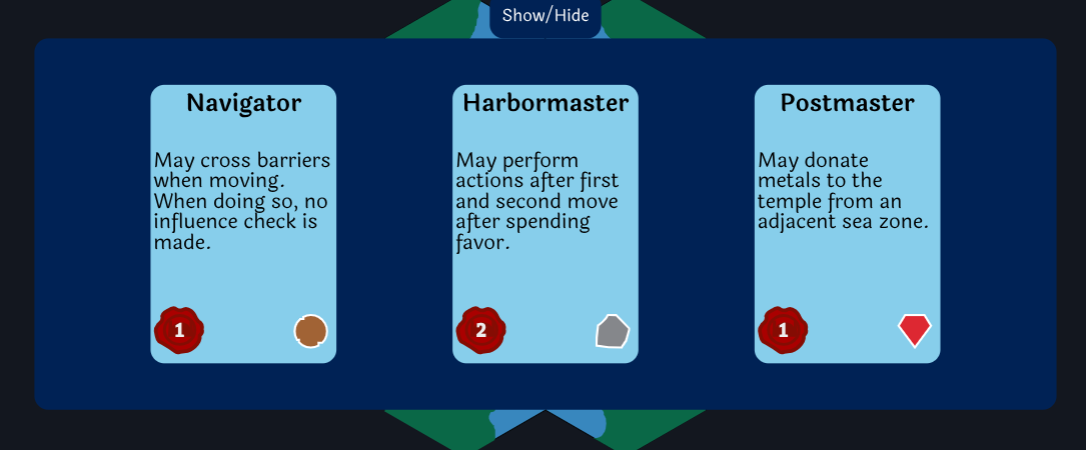 Action: Donate commodities: Click to remove the required commodities from your cargo and receive the amount of VP and favor depicted. Clicking will also shift the market cards.