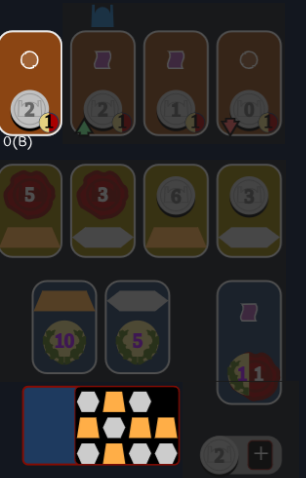 A small arrow in the bottom left corner signifies that the standard coin value has been modified. The upwards green arrow means +1 value and the downwards red arrow -1 value, respectively. These two modifiers are assigned randomly to the three market slots at the start of the game and are not linked to the market cards themselves.